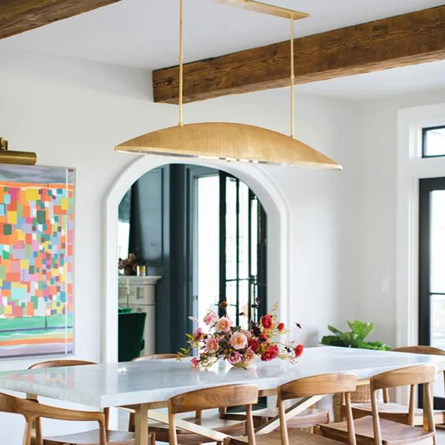 Crafted with natural woven textures and warm metallic accents, the Mar Pendant brings softness and character to dining rooms. It’s a beautiful option for coastal-inspired or relaxed yet elevated spaces.